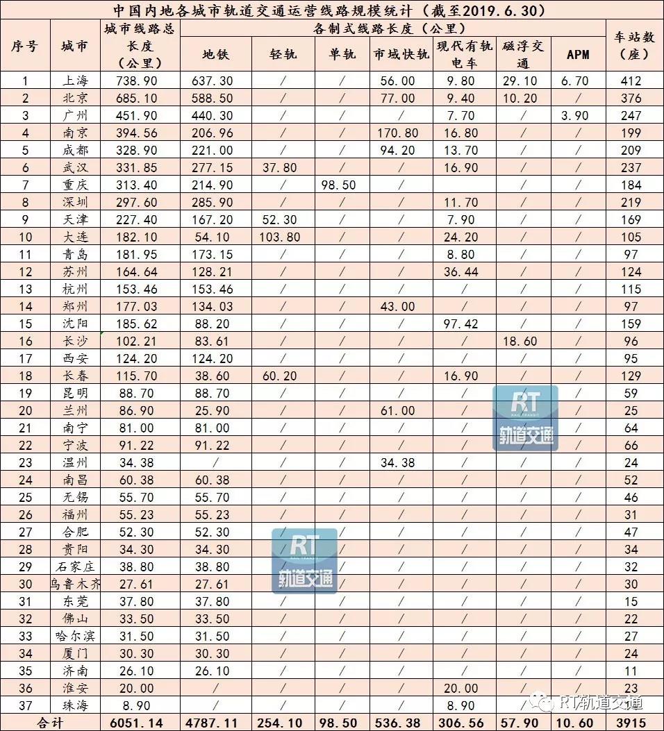 截至2019年6月30日,中国内地各城市轨道交通运营线路规模达到6051.14公里,车站数总计3915座,涉及城市37个。