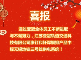 通过亚冠全体员工不断进取与不懈努力,江苏亚冠轨道交通科技有限公司胀钉和钎焊铜排产品中标无锡地铁三号线供电系统!