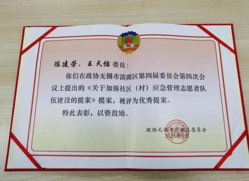 ▲江苏亚冠轨道交通科技有限公司董事长陈建荣提出的《关于加强社区(村)应急管理志愿者队伍建设的提案》《关于为企业纾困解难建立政府挂钩民营企业制度的建议》两个提案也被评为优秀提案