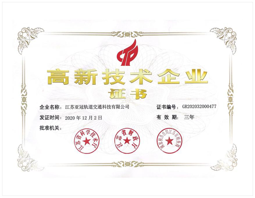 2020年12月2日,江苏亚冠轨道交通科技有限公司获得由江苏省科学技术厅、江苏省财政厅、国家税务总局江苏省税务局联合颁发的“高新技术企业”认定证书,江苏亚冠轨道交通科技有限公司正式迈入高新技术企业行列!
